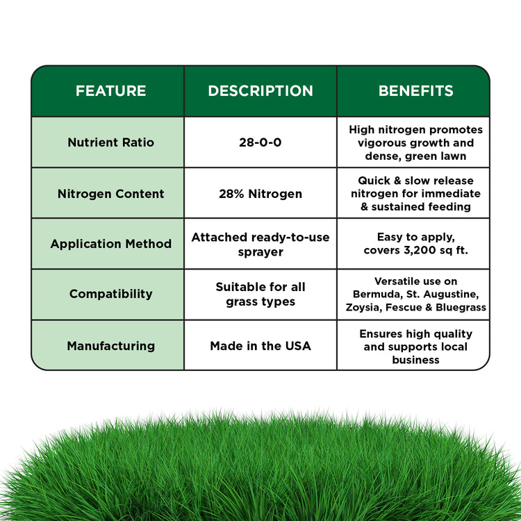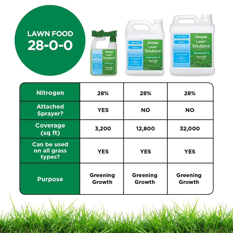28-0-0 High Nitrogen Lawn Food contains 70% quick-release nitrogen fertilizer to jump-start greening and growth and 30% slow-release liquid nitrogen so growth doesn't drop between applications. This Lawn Food is best to enhance green and growth or to correct Nitrogen nutrient deficiency.