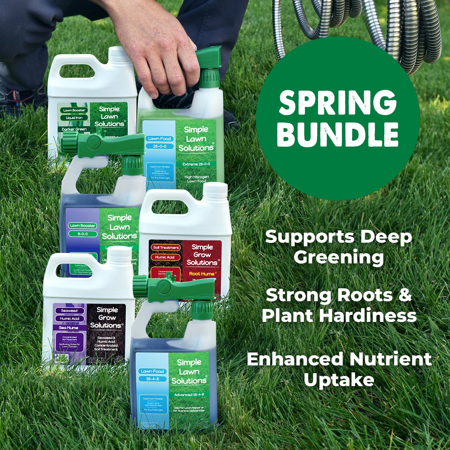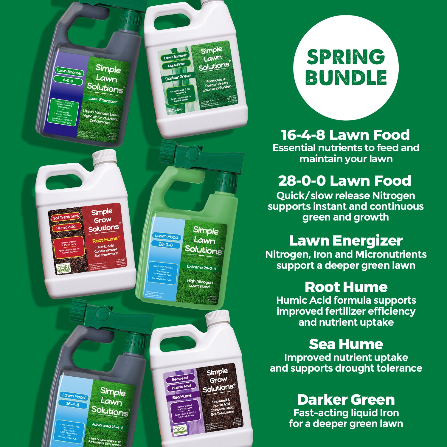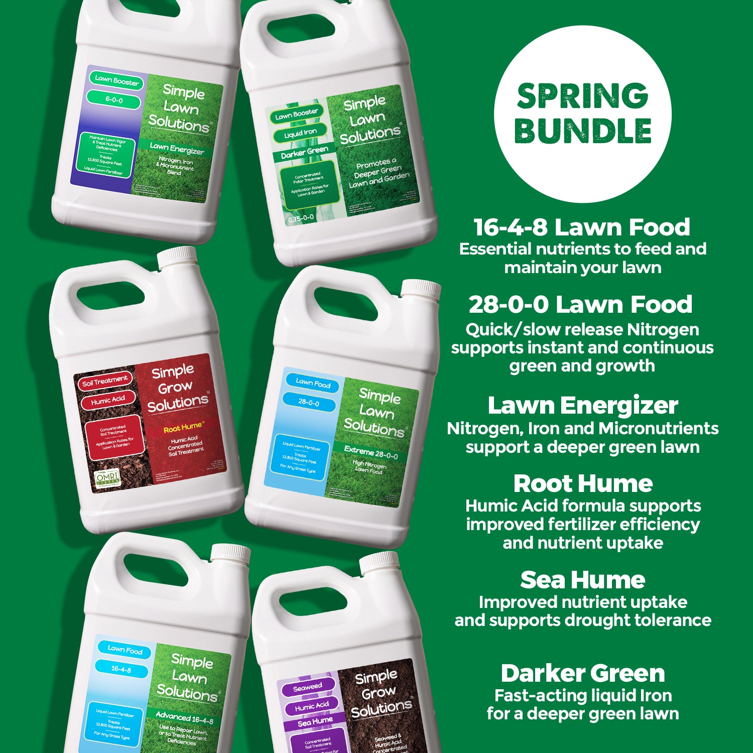 • The Large Spring Bundle contains: 16-4-8 Advanced Lawn Food, Darker Green Liquid Iron, Lawn Energizer, Root Hume, and Sea Hume