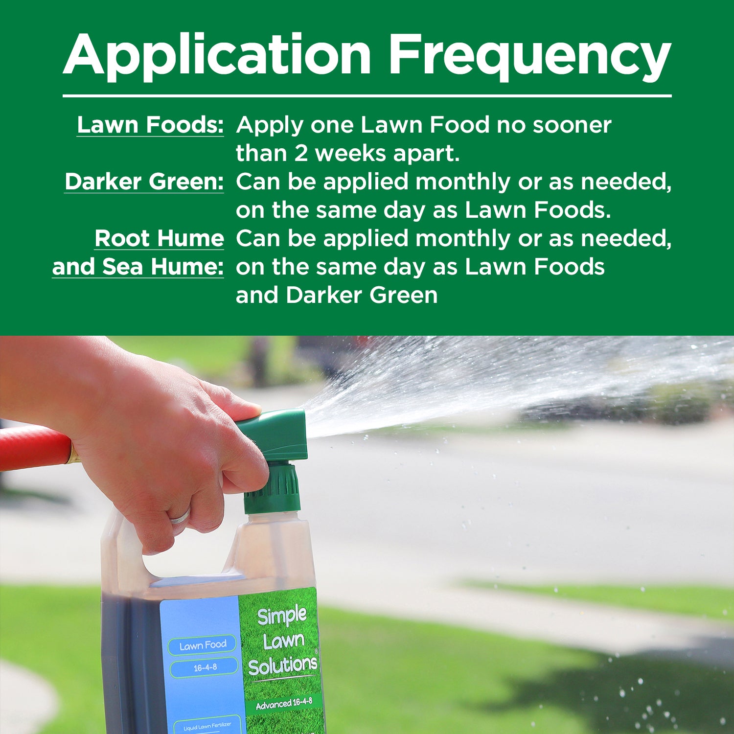For best results, water the lawn for 20 minutes within 24 hours of application. Water is essential for maintaining your lawn, and your lawn should receive 1-2 inches of water per week. Fertilizer will not treat a lawn that is suffering from disease, pests, weed infestations, or drought, and these conditions should be treated separately. Darker Green is best applied as a foliar treatment and not watered in.